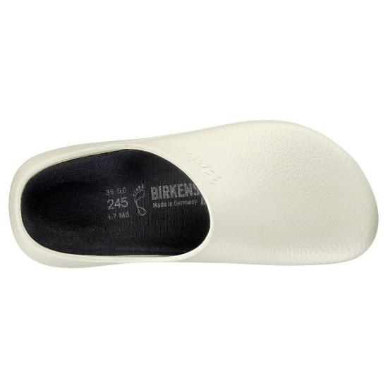 Die kompakte Form des Super -Birkis besteht aus wasser- und schmutzabweisendem Polyurethan, das zudem öl- und fettbeständig ist. Dieses extrem beständige Material kann bei bis zu 60° Celsius gewaschen und effektiv desinfiziert werden. Durch seine Beständigkeit und Hygieneeigenschaften eignet er sich ideal für die Küche, Medizin und Lebensmittelindustrie – aber auch als praktischer Garten-Clog.