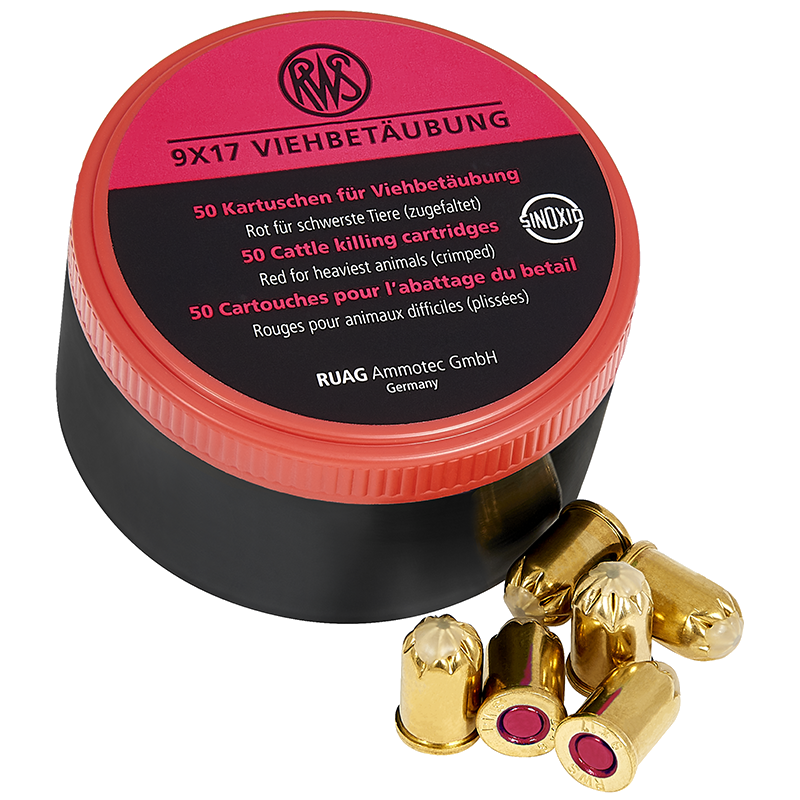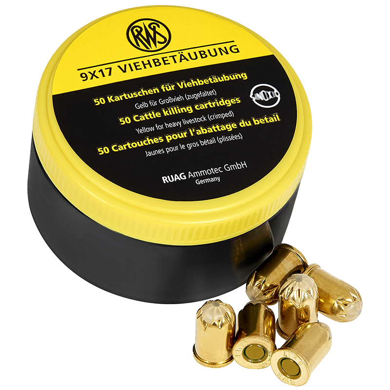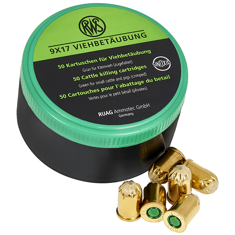 Schussapparate der Firma turbocut Vernickelte Bolzenschussgerät zur Viehbetäubung mit neuem „Cartridge Security System“. Alle Apparate mit Kaliber 9 x 17mm. Bullen Blitz (BB): für schwere Tiere (nur rote Kartuschen) (2,21kg) Kleiner Blitz (KB): für z.B. Ferkel (nur grüne Kartuschen) (2,25kg) Blitz Schlag (BS): nicht eindringend (nur grüne Kartuschen) (2,23kg) Blitz Kerner (BK): das Original (2,60kg)
